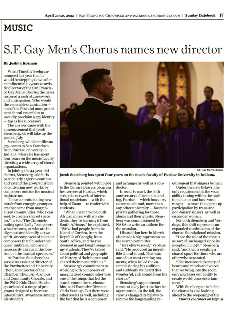 The San Francisco Gay Men’s Chorus selected Jacob Stensberg as its new artistic director after a national search. He brings experience leading choirs at Purdue University and a commitment to new music and emerging composers. His appointment reflects the Chorus’s ongoing work to expand access and welcome all singers who perform in the tenor and bass range.